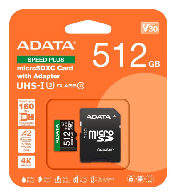 | Kokkuvõte | ADATA Speed Plus. Capacity: 512 GB, Flash card type: MicroSDXC, Flash memory class: Class 10, Read speed: 180 MB/s, Write speed: 160 MB/s, UHS Speed Class: Class 3 (U3), Video Speed Class: V30. Protection features: Drop proof, Magnet proof, Temperature proof, Waterproof, X-ray proof, Product colour: Black, Green, White |