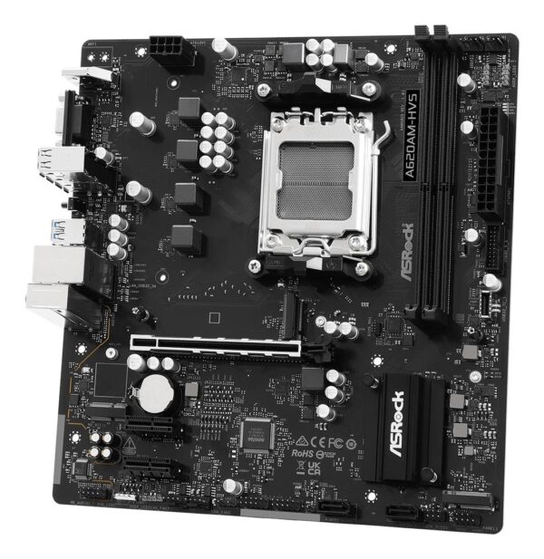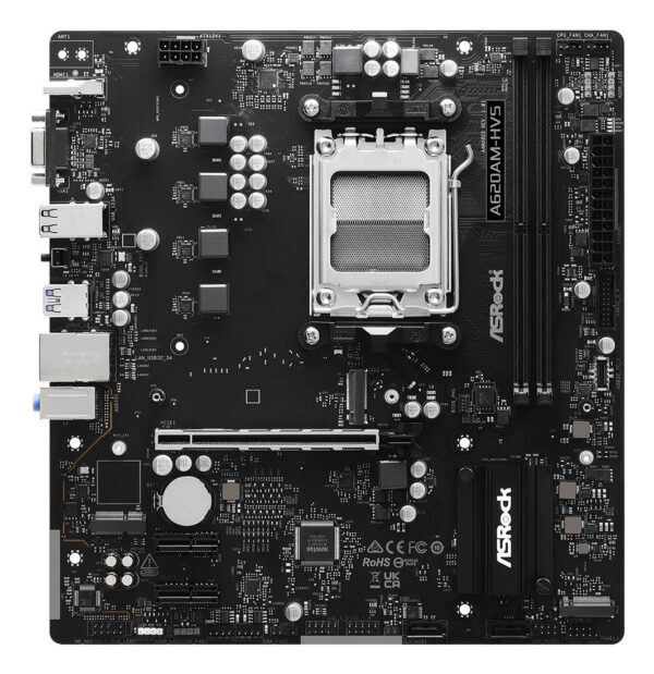 AMD A620A | micro ATX | Audio 7.1 channels | CPU AMD | Socket Socket AM5 | Series AMD Ryzen 7000 Series/AMD Ryzen 8000 Series/AMD Ryzen 9000 Series | Supported memory types DDR5-SDRAM | 2xNumber of memory slots | Memory slots type DIMM | Supported storage drive interfaces PCI Express 3.0,PCI Express 4.0,SATA III | 3840 x 2160 pixels | 4xUSB 2.0 ports quantity | 4xUSB 3.2 Gen 1 (3.1 Gen 1) Type-A ports quantity | 1xEthernet LAN (RJ-45) ports | 1xVGA (D-Sub) ports quantity | 1xHDMI ports quantity