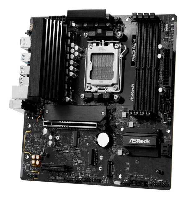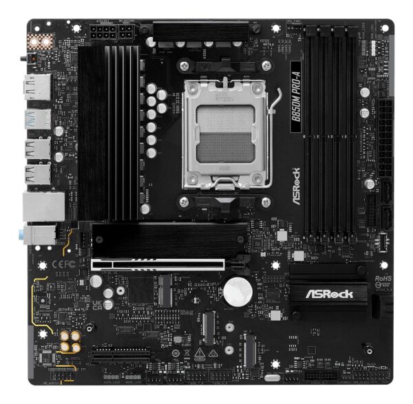 AMD B850 | micro ATX | Audio 7.1 channels | CPU AMD | Socket Socket AM5 | Series AMD Ryzen 7000 Series/AMD Ryzen 8000 Series/AMD Ryzen 9000 Series | Supported memory types DDR5-SDRAM | 4xNumber of memory slots | Memory slots type DIMM | Supported storage drive interfaces PCI Express 4.0,PCI Express 5.0,SATA III | 3840 x 2160 pixels | 4xUSB 2.0 ports quantity | 2xUSB 3.2 Gen 1 (3.1 Gen 1) Type-A ports quantity | 1xUSB 3.2 Gen 2 (3.1 Gen 2) Type-A ports quantity | 1xUSB 3.2 Gen 2 (3.1 Gen 2) Type-C ports quantity | 1xEthernet LAN (RJ-45) ports | 1xHDMI ports quantity