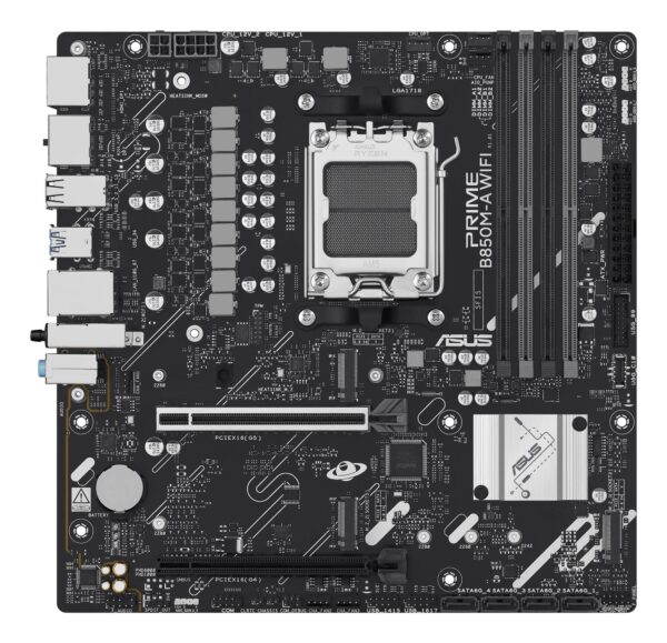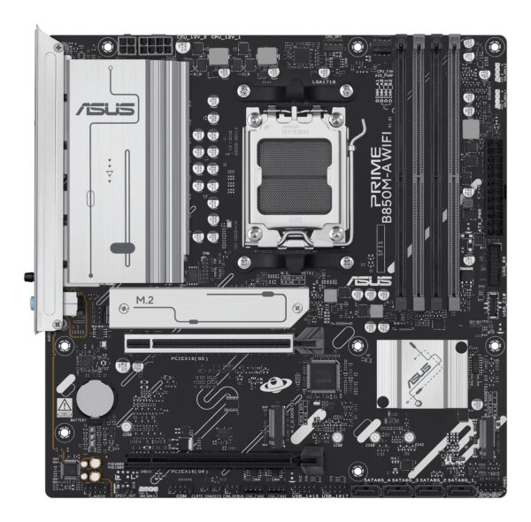 | Kokkuvõte | ASUS PRIME B850M-A WIFI. Processor manufacturer: AMD, Processor socket: Socket AM5, Compatible processor series: AMD Ryzen 7000 Series, AMD Ryzen 8000 Series, AMD Ryzen 9000 Series. Supported memory types: DDR5-SDRAM, Maximum internal memory: 256 GB, Memory slots type: DIMM. Supported storage drive interfaces: M.2, SATA III, Supported storage drive types: HDD & SSD, RAID levels: 0, 1, 5, 10. Ethernet interface type: 2.5 Gigabit Ethernet, Fast Ethernet, Gigabit Ethernet, Top Wi-Fi standard: Wi-Fi 6E (802.11ax). Component for: PC, Motherboard form factor: micro ATX, Motherboard chipset family: AMD |