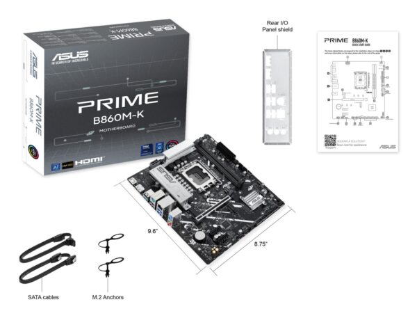 | Kokkuvõte | ASUS PRIME B860M-K. Processor manufacturer: Intel, Processor socket: LGA 1851 (Socket V1), Compatible processor series: Intel Core Ultra (Series 2). Supported memory types: DDR5-SDRAM, Maximum internal memory: 128 GB, Memory slots type: DIMM. Supported storage drive interfaces: M.2, SATA III, Supported storage drive types: HDD & SSD, RAID levels: 0, 1, 5, 10. Ethernet interface type: 2.5 Gigabit Ethernet. Component for: PC, Motherboard form factor: micro ATX, Motherboard chipset family: Intel |