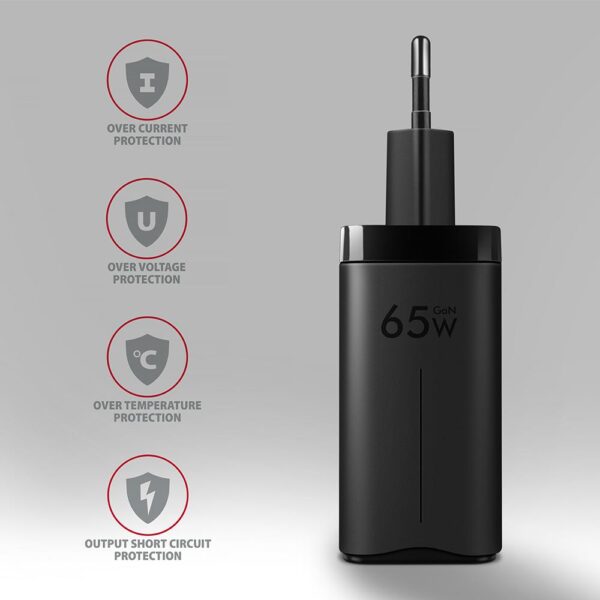 | Kokkuvõte | Axagon ACU-DPQ65 GaN Wall charger 65W, 3x port (USB-A + dual USB-C), PD3.0/QC4+/PPS/Apple. Charger type: Indoor, Power source type: AC, Charger compatibility: Mobile phone, Netbook, Laptop, Smartphone, Smartwatch, Tablet, Universal. Input voltage: 100 – 240 V, Maximum output voltage: 20 V. USB 2.0 ports quantity: 1, USB Type-C ports quantity: 2, Fast charging, Power protection features: Over voltage, Overheating, Overload, Short circuit. Product colour: Black |