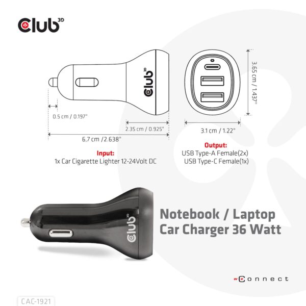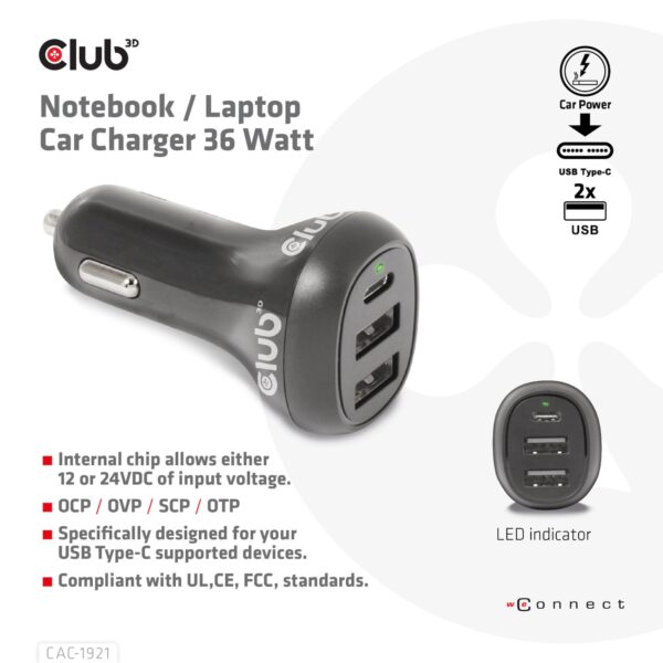 | Kokkuvõte | CLUB3D Notebook / Laptop Car Charger 36 Watt. Charger type: Auto, Power source type: Cigar lighter, Charger compatibility: Laptop. Maximum output voltage: 24 V. USB 2.0 ports quantity: 2, USB Type-C ports quantity: 1, Power protection features: Over current, Over voltage, Overload, Short circuit. Product colour: Black |