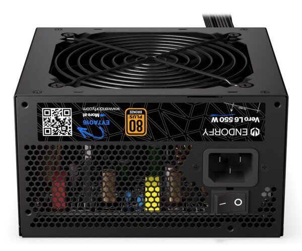 | Kokkuvõte | ENDORFY Vero L6. Total power: 550 W, AC input voltage: 200 – 240 V, AC input frequency: 50 Hz. Motherboard power connector: 24-pin ATX, Motherboard power cable length: 57 cm, SATA power cable length: 500,800 mm. Purpose: PC, Power supply unit (PSU) form factor: ATX, 80 PLUS certification: 80 PLUS Bronze. Product colour: Black, Cooling type: Active, Fan diameter: 12 cm. Cables included: AC |