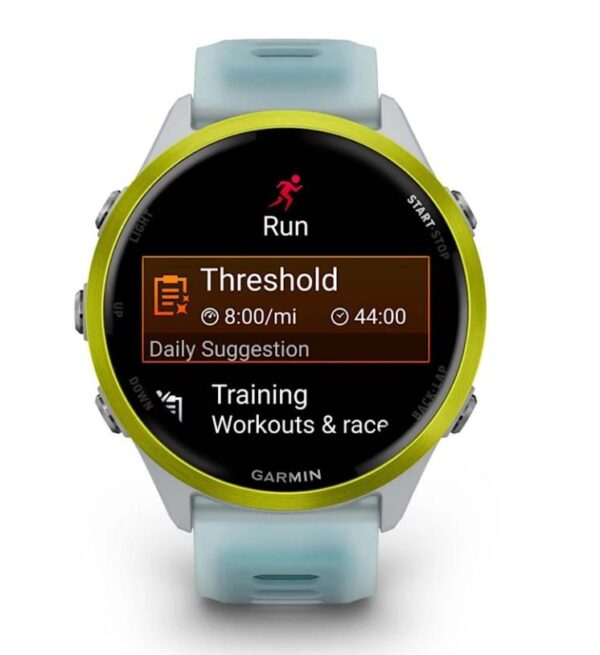 Forerunner 570 | 3.56 cm (1.4″) | AMOLED | Display type Digital | Display resolution 454 x 454 pixels | Touchscreen Yes | Flash memory 8 GB | Band material Silicone | Shape Round | Market positioning Smartwatch | Watch case size 47 mm | Watch case colour Yellow/White | Watch case material Aluminium | Band colour Blue/White | Heart rate monitor Yes | Wi-Fi Yes | Battery type Built-in battery | Battery technology Lithium-Ion (Li-Ion) | Battery life 10 day(s) | Weight 50 g