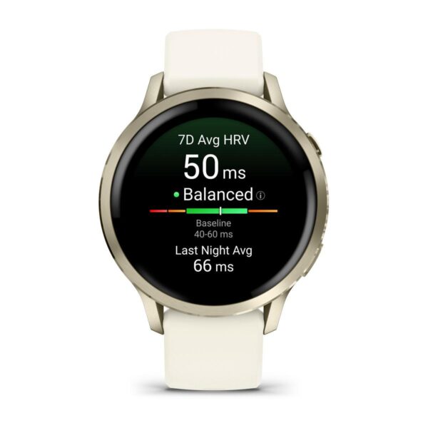 Venu 4 | 3.05 cm (1.2″) | AMOLED | Display type Digital | Display resolution 390 x 390 pixels | Touchscreen Yes | Watch glass type Corning Gorilla Glass 3 | Flash memory 8 GB | Band material Silicone | Shape Round | Market positioning Smartwatch | Watch case size 41 mm | Watch case colour Gold | Watch case material Polymer,Stainless steel | Heart rate monitor Yes | Wi-Fi Yes | Battery type Built-in battery | Battery technology Lithium-Ion (Li-Ion) | Battery life (max) 432 h | Battery life 10 day(s) | Weight 33 g