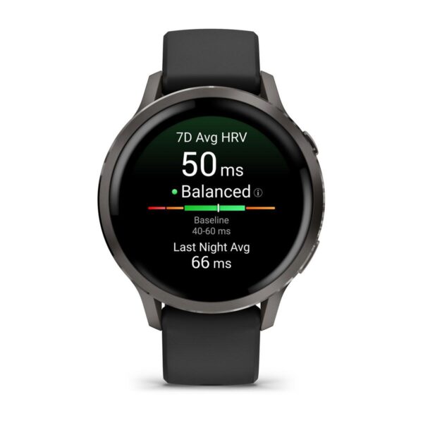 Venu 4 | 3.05 cm (1.2″) | AMOLED | Display type Digital | Display resolution 390 x 390 pixels | Touchscreen Yes | Watch glass type Corning Gorilla Glass 3 | Flash memory 8 GB | Band material Silicone | Shape Round | Market positioning Smartwatch | Watch case size 41 mm | Watch case colour Black | Watch case material Polymer,Stainless steel | Band colour Black | Heart rate monitor Yes | Wi-Fi Yes | Battery type Built-in battery | Battery technology Lithium-Ion (Li-Ion) | Battery life (max) 432 h | Battery life 10 day(s) | Weight 33 g