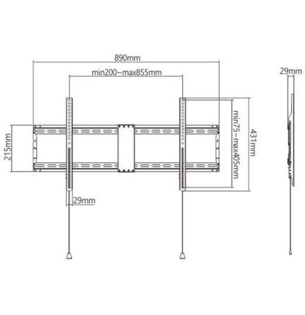 1xNumber of displays supported | Maximum weight capacity 70 kg | Minimum screen size 43 ” | Maximum screen size 90 ” | Minimum VESA mount 200 x 200 mm | Maximum VESA mount 800 x 400 mm | Mounting type Wall | Colour Black | Housing material Steel | Weight 2.37 kg