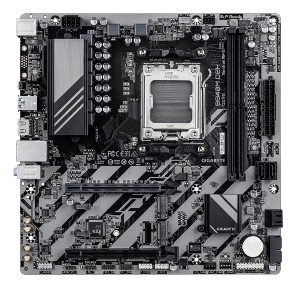 | Kokkuvõte | GIGABYTE B840M D2H Motherboard – AMD Ryzen 9000 CPUs, 5+2+2 Phases VRM, up to 7600MHz DDR5, 1xPCIe 4.0 + 1xPCIe 3.0 M.2, 2.5GbE LAN, USB 3.2 Gen 1. Processor manufacturer: AMD, Processor socket: Socket AM5, Compatible processor series: AMD Ryzen 7000 Series, AMD Ryzen 8000 Series, AMD Ryzen 9000 Series. Supported memory types: DDR5-SDRAM, Maximum internal memory: 128 GB, Memory slots type: DIMM. Supported storage drive interfaces: M.2, PCI Express 4.0, SATA III, Supported storage drive types: HDD & SSD, RAID levels: 0, 1, 10. Maximum resolution: 4096 x 2160 pixels. Ethernet interface type: 2.5 Gigabit Ethernet, LAN controller: Realtek RTL8125 |