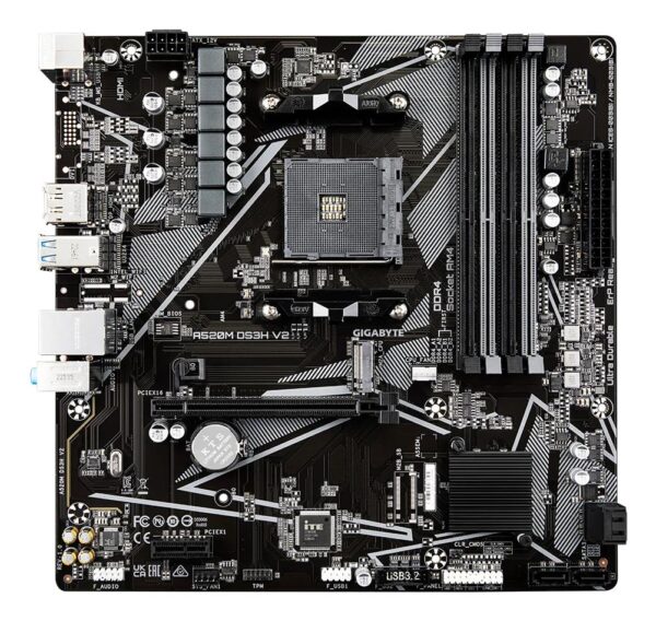 GIGABYTE A520M DS3H V2 Motherboard – Supports AMD Ryzen 5000 Series AM4 CPUs, up to 4733MHz DDR4 (OC), PCIe 3.0 x16, GbE LAN, USB 3.2 Gen 1. Processor manufacturer: AMD, Processor socket: Socket AM4, Compatible processor series: AMD Ryzen 3000 Series, AMD Ryzen Threadripper 3000 Series, AMD Ryzen Threadripper PRO 3000 WX-Series. Supported memory types: DDR4-SDRAM, Maximum internal memory: 128 GB, Memory slots type: DIMM. Supported storage drive interfaces: M.2, SATA III, Supported storage drive types: HDD & SSD, RAID levels: 0, 1, 10. Maximum resolution: 5120 x 2880 pixels. USB connector type: USB Type-A