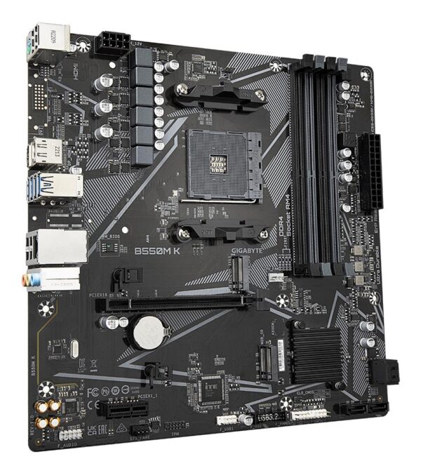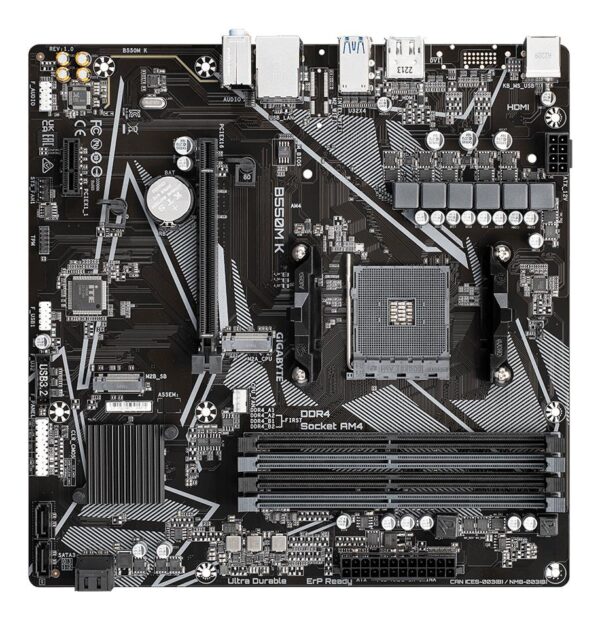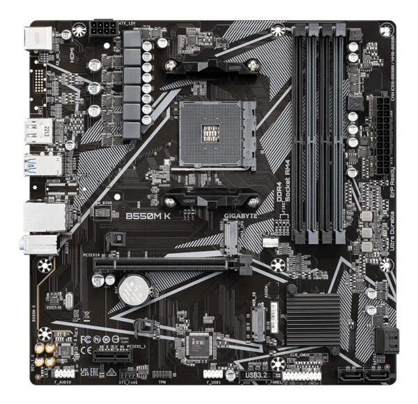 | Kokkuvõte | GIGABYTE B550M K Motherboard – AMD Ryzen 5000 CPUs, up to 4733MHz DDR4, 1xPCIe 4.0 + 1xPCIe 3.0 M.2, 1GbE LAN, USB 3.2 Gen 1. Processor manufacturer: AMD, Processor socket: Socket AM4, Compatible processor series: AMD Ryzen 3000 Series, AMD Ryzen 4000 Series, AMD Ryzen 5000 Series. Supported memory types: DDR4-SDRAM, Maximum internal memory: 128 GB, Memory slots type: DIMM. Supported storage drive interfaces: M.2, SATA, Supported storage drive types: HDD & SSD, RAID levels: 0, 1, 10. Maximum resolution: 5120 x 2880 pixels. Ethernet interface type: Gigabit Ethernet, LAN controller: Realtek RTL8111H |