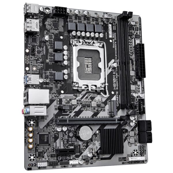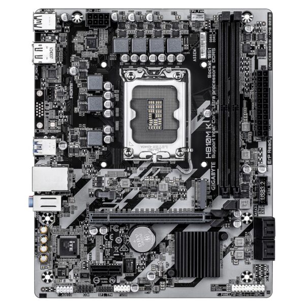 GIGABYTE H810M K Motherboard – Intel Core Ultra (Series 2) CPUs, 3+1+2 Phases VRM, up to 6400MHz DDR5, 1xPCIe 4.0 M.2, 1GbE LAN, USB 3.2 Gen 1. Processor manufacturer: Intel, Processor socket: LGA 1851 (Socket V1), Compatible processor series: Intel Core Ultra (Series 2). Supported memory types: DDR5-SDRAM, Maximum internal memory: 128 GB, Memory slots type: DIMM. Supported storage drive interfaces: M.2, PCI Express 4.0, SATA III, Supported storage drive types: HDD & SSD, RAID levels: 0, 1, 5, 10. Maximum resolution: 4096 x 2160 pixels. Ethernet interface type: Gigabit Ethernet, LAN controller: Realtek RTL8111H