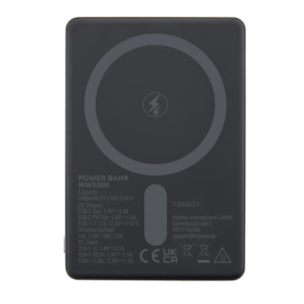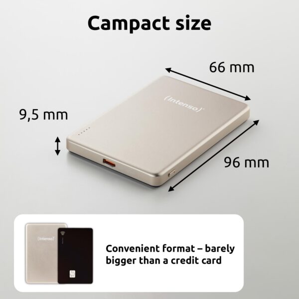 | Kokkuvõte | Intenso MW5000 Magnetic Power Bank 5000 mAh – MagSafe Compatible, 15W Wireless Charging, 20W USB-C PD, Slim & Compact – Tested in Germany – Champagne. Battery capacity: 5000 mAh, Battery technology: Lithium Polymer (LiPo), Fast charging technology: Power Delivery, Programmable Power Supply (PPS), Battery voltage: 3.85 V. USB Type-C ports quantity: 1. Wireless charging. Product colour: Champagne |