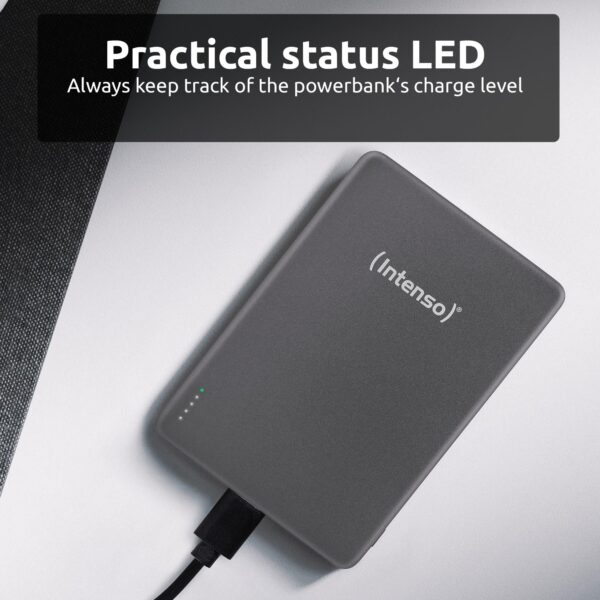 | Kokkuvõte | Intenso MW5000 Magnetic Power Bank 5000 mAh – MagSafe Compatible, 15W Wireless Charging, 20W USB-C PD, Slim & Compact – Tested in Germany – Gray. Battery capacity: 5000 mAh, Battery technology: Lithium Polymer (LiPo), Fast charging technology: Power Delivery, Programmable Power Supply (PPS), Battery voltage: 3.85 V. USB Type-C ports quantity: 1. Wireless charging. Product colour: Grey |