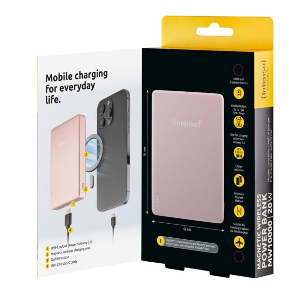 | Kokkuvõte | Intenso MW10000 Magnetic Power Bank 10000 mAh – MagSafe Compatible, 15W Wireless Charging, 20W USB-C PD, For iPhone & Android – Tested in Germany – Rosé. Battery capacity: 10000 mAh, Battery technology: Lithium Polymer (LiPo), Fast charging technology: Power Delivery, Programmable Power Supply (PPS), Battery voltage: 3.85 V. USB Type-C ports quantity: 1. Wireless charging. Product colour: Rose |