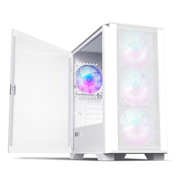 Montech Air 100 ARGB. Form factor: Mini Tower, Type: PC, Product colour: White. Power supply location: Bottom, Supported power supply form factors: ATX. Front fans installed: 3x 120 mm, Front fans diameters supported: 120,140 mm, Rear fans installed: 1x 120 mm. Supported HDD sizes: 3.5", SSD form factor: 2.5". Width: 210 mm, Depth: 405 mm, Height: 425 mm