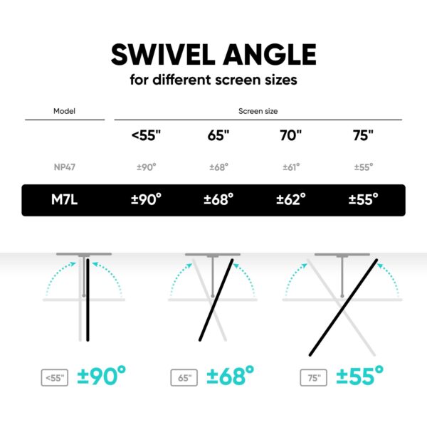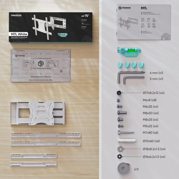 | Kokkuvõte | ONKRON M7L-W. Maximum weight capacity: 68 kg, Minimum screen size: 101.6 cm (40"), Maximum screen size: 190.5 cm (75"), Minimum VESA mount: 100 x 100 mm, Maximum VESA mount: 600 x 400 mm. Angle of rotation: 4°, Distance to the wall (min): 11 cm, Distance to the wall (max): 71.1 cm. Product colour: White |