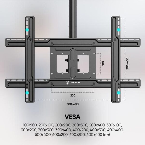 ONKRON Ceiling mount for TV 32"-80" max 68 kg, tilt-swivel, black. Maximum weight capacity: 68.2 kg, Minimum screen size: 81.3 cm (32"), Maximum screen size: 2.03 m (80"), Minimum VESA mount: 100 x 100 mm, Maximum VESA mount: 600 x 200 mm. Tilt angle range: -15 – 5°, Angle of rotation: 60°. Product colour: Black