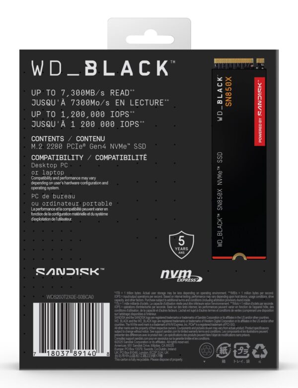 SSD series Black SN850X | POWERED BY SANDISK | 2000 GB | M.2 | PCI Express 4.0 | NVMe Yes | Component for PC | Write speed 6600 MB/s | Read speed 7300 MB/s | 1200xTBW rating | Weight 7.5 g | Operating temperature (T-T) 0 – 85 °C