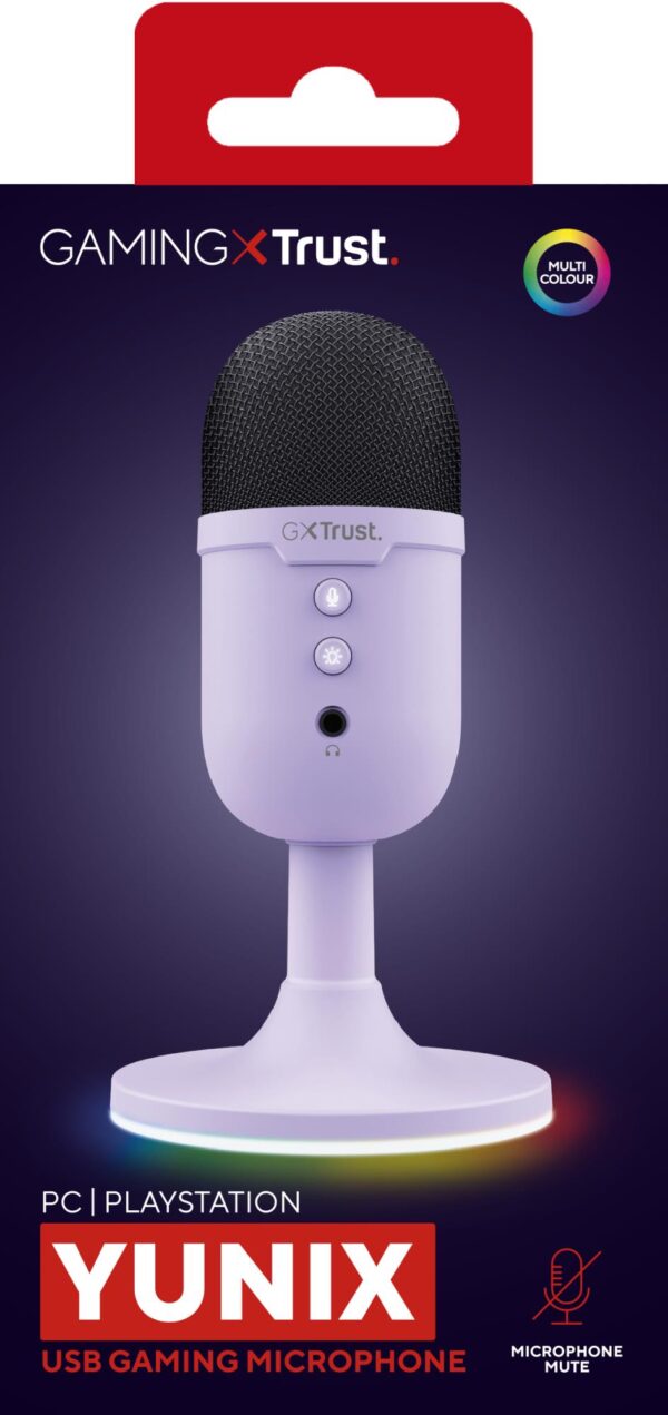 | Kokkuvõte | Trust GXT 234P Yunix. Type: Table microphone, Microphone sensitivity: 32 dB, Microphone frequency: 100 – 16000 Hz. Connectivity technology: Wired, Device interface: USB/3.5 mm, USB connector type: USB Type-A. Product colour: Purple, Control type: Buttons, Cable length: 1.8 m. Power source: USB. Height: 108 mm, Diameter: 5.5 cm, Microphone weight: 216 g |