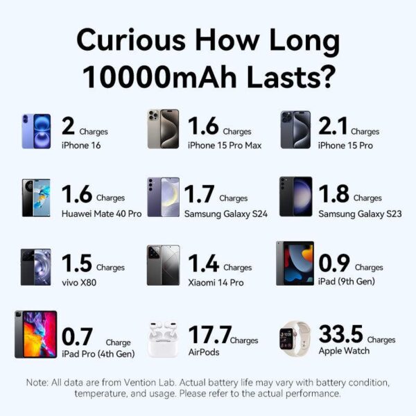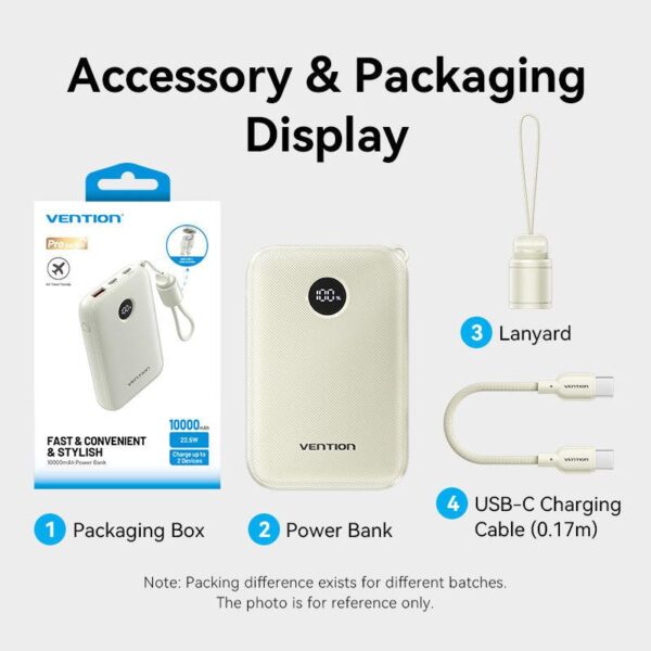 | Kokkuvõte | Vention FKAP0-C. Battery capacity: 10000 mAh. USB Type-A output ports: 1, USB Type-C ports quantity: 2. Total output power: 22.5 W. Product colour: Pink |