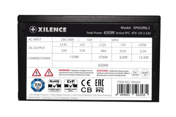 | Kokkuvõte | Xilence Performance C XP650R6.2. Total power: 650 W, AC input voltage: 200 – 240 V, AC input frequency: 50 Hz. Motherboard power connector: 20+4 pin ATX, Motherboard power cable length: 50 cm, Cabling type: Non-Modular. Purpose: PC, Power supply unit (PSU) form factor: ATX, 80 PLUS certification: 80 PLUS Gold. Product colour: Black, Cooling type: Active, Fan diameter: 12 cm |